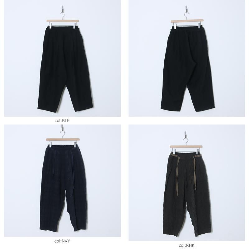 | (VOICE) ウエストはゴムとリボンで調節ができ、腰回りにもゆとりのあるシルエットで幅広いサイズに対応します。凹凸感のある生地感で落ち着きのある色合いなのでさりげないポイントになります。 |
