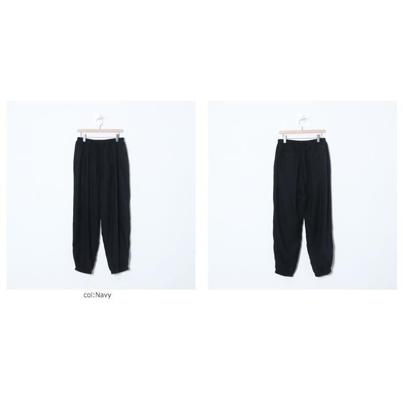 ウエストをドローストリング仕様にした、リラックス感のあるイージーパンツ。裾にはドローコードを配し素材の柔らかさを活かすため、裏地を付けた総裏仕様にすることで、着用時に美しい膨らみと立体感が生まれるよう設計されています。