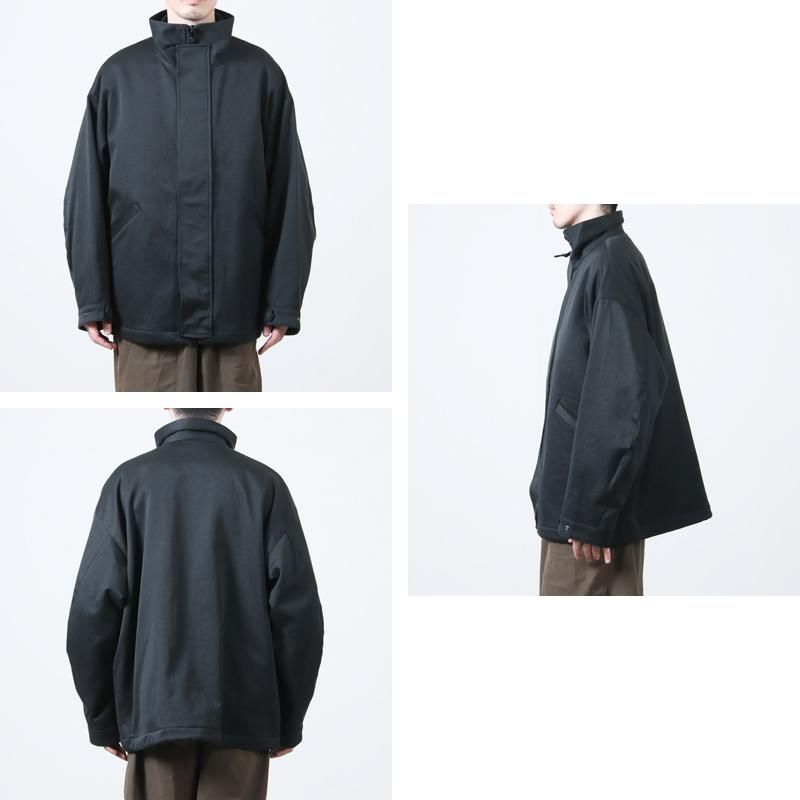 高さのあるスタンドカラーと、そこから続くフラップ付きの比翼式フロントが特徴的で、首元をしっかりと覆う機能的な仕様です。フロントはダブルジップ、腰にはハンドポケット、内側にもジップポケットを備えています。