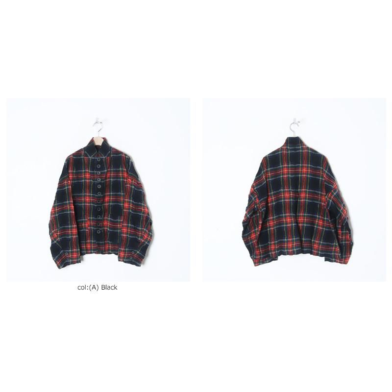 (VOICE) カットソーを合わせてゆとりがあり、インに薄手のニットなども合わせせられるサイズ感でした。ボタンを首元まで留めることで、また違った雰囲気で楽しめるのもポイントです。コットンウールのあたたかみとチェックの風合いが素敵です。 |