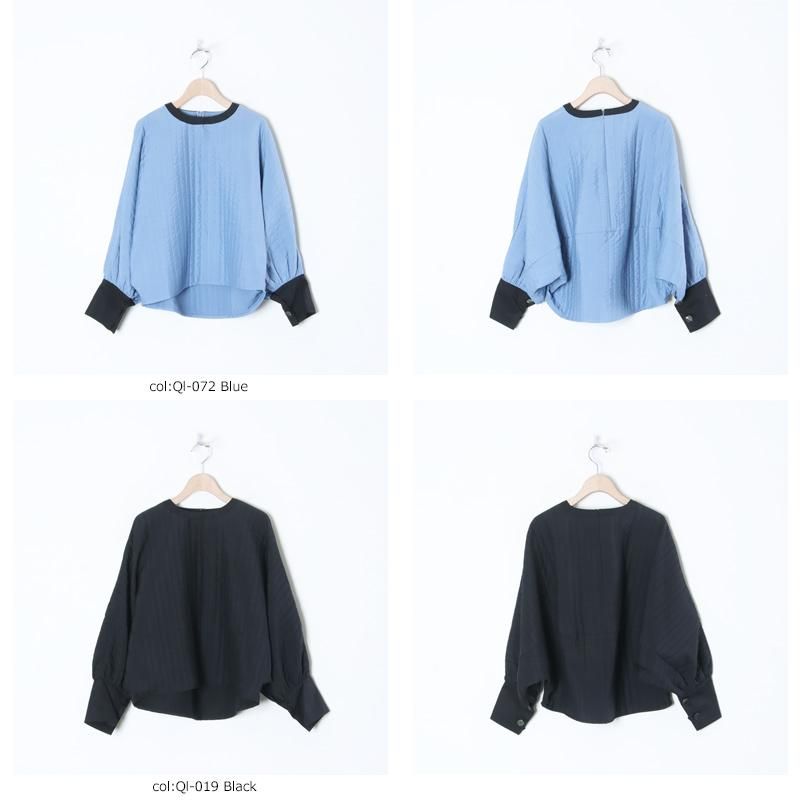 丸みを帯びたフォルムが女性らしく、衿、袖口は布帛に切り替えられたメリハリのある袖口の長めのリブが引き締め役に。