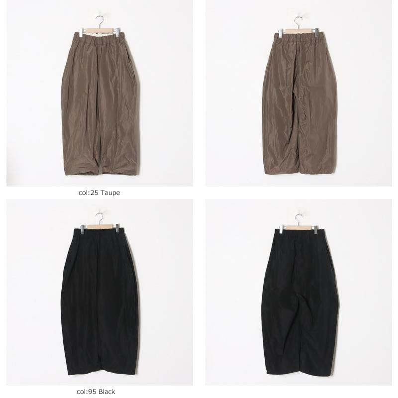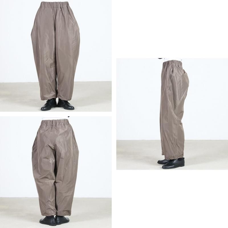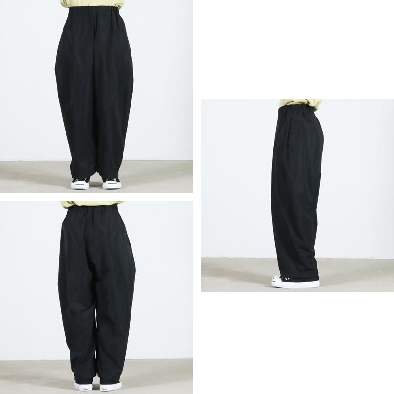 ゆったりとしたフルレングスのワイドシルエットながら、もも位置で横に張り出すユニークな形と、裾のギャザー・ゴム(内側で調節可能)が、立体感とメリハリをプラス。