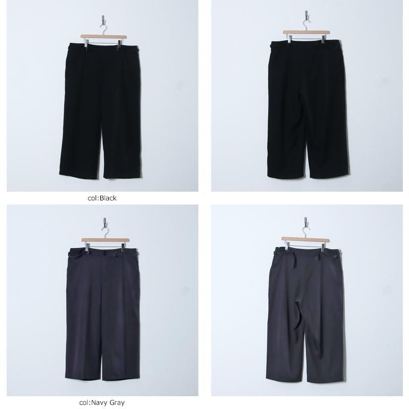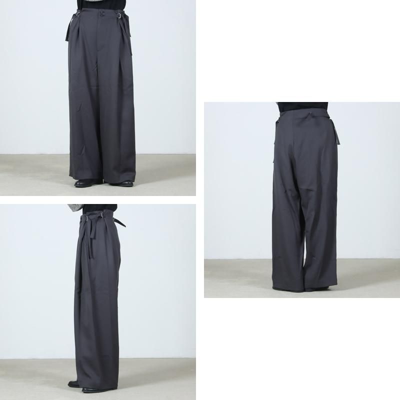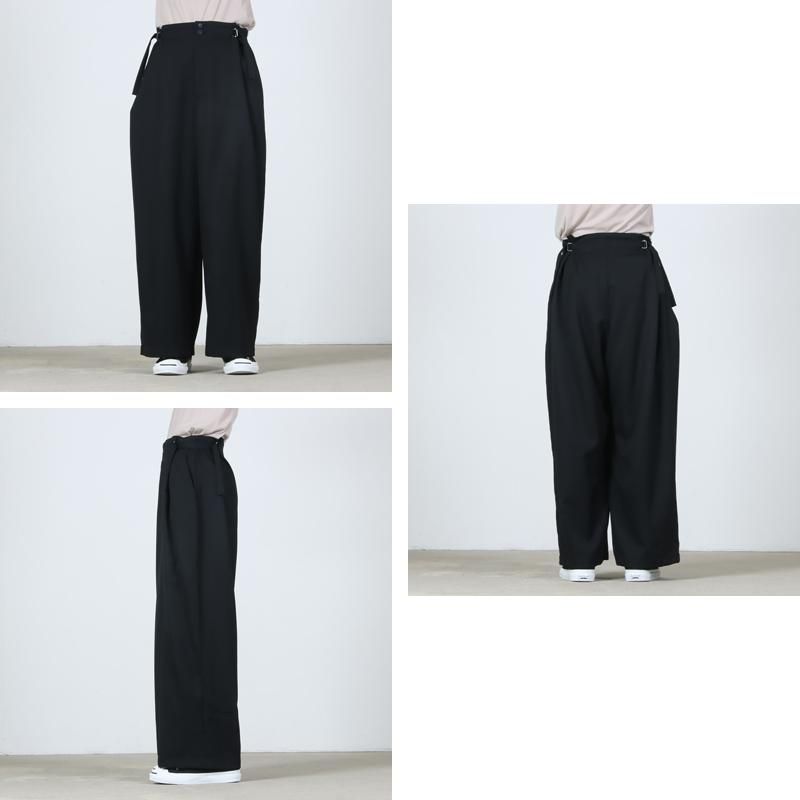 存在感のあるワイドパンツ。フロントとバックに合計4つのアジャスターを備えており、締めることでウエストの調節ができるだけでなく、タックが生まれ、美しいシルエットと快適な着心地に。