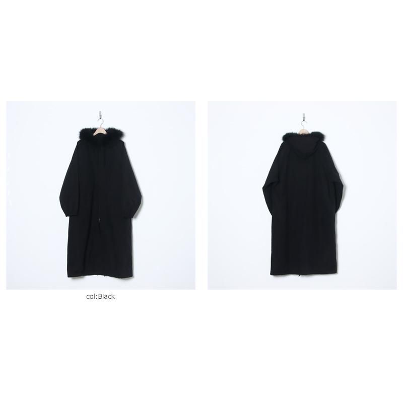 ファーを付けた際の存在感のある佇まいと、外した際の洗練された表情。気分やスタイルに合わせて使い分けることができる、COMOLIならではの一着です。