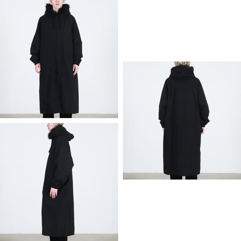シルエットは、着丈を長く設定した、分量のあるフォルムが特徴。フロントはダブルジップ仕様、裾にはドローコードが配されており、シルエットのアレンジや着こなしの幅を広げることが可能です。