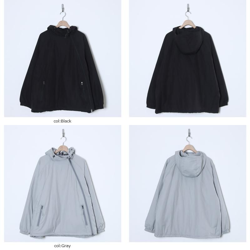 立体的なシワ加工を施したナイロンシェルに、斜めに走るジップラインが印象的なフーデッドジャケットです。