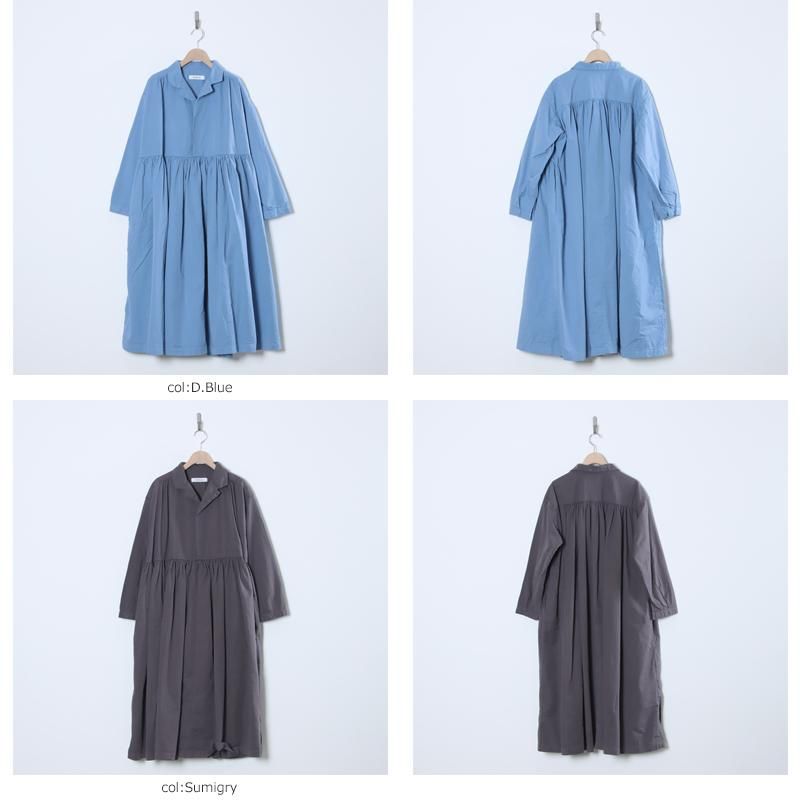ウエストにたっぷりとギャザーを寄せたボリュームのあるAラインワンピース。オープンカラーとボタンレスの前開きによりラフな雰囲気になっています。