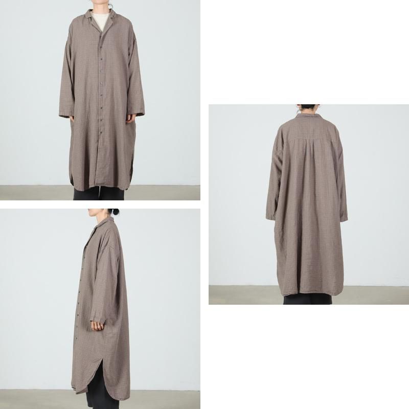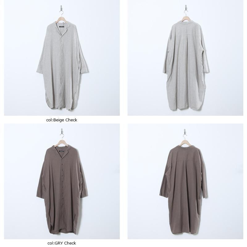 オープンカラーとゆとりのあるシルエットがリラックス感を演出し、Beige Check は製品洗い、GRY Check は製品染めを施すことで、どちらも肌なじみの良い柔らかな風合いに仕上げています。