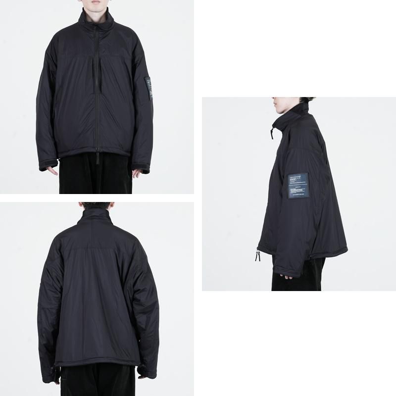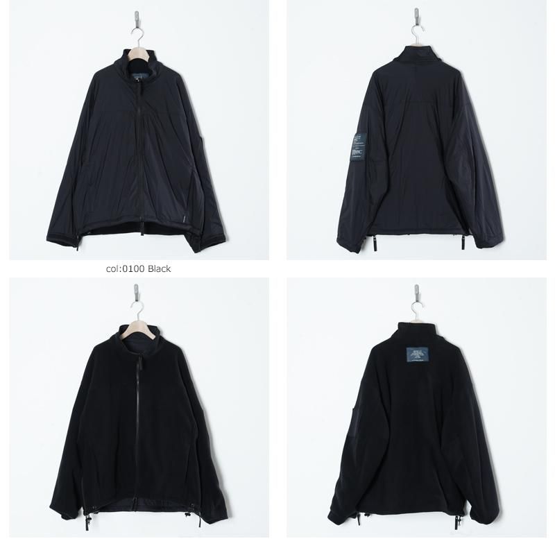 左袖またはポケット内側にベルクロ仕様の可動式ミルスペックを、フリース側背面にサイズスペックを配置。肩はドロップショルダー仕様で丸みのあるボックスシルエット。