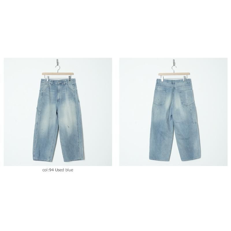 | (VOICE) サイズ0を着用。レングスは9分丈ですっきりめ、ウエスト腰まわりはゆとりのあるサイズ感です。程よいボリューム感のワイドシルエットでリラックス感があります。長年穿きこんだようなUSED加工とペイント加工がポイントの一本。 |