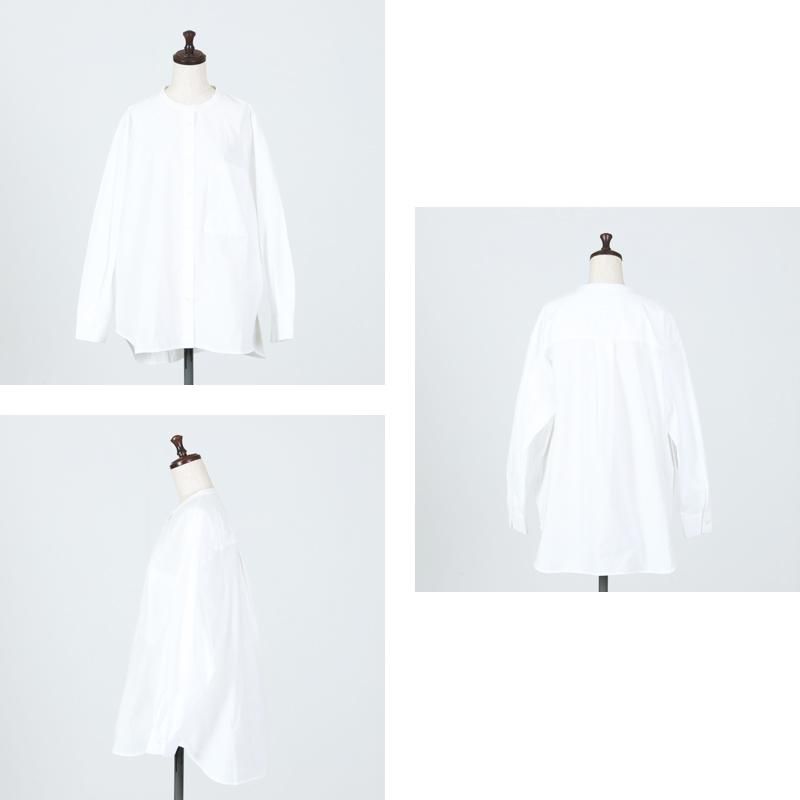 メンズライクなバンドカラーシャツを曲線で女性らしいシルエットに落とし込んだ品のある一着。