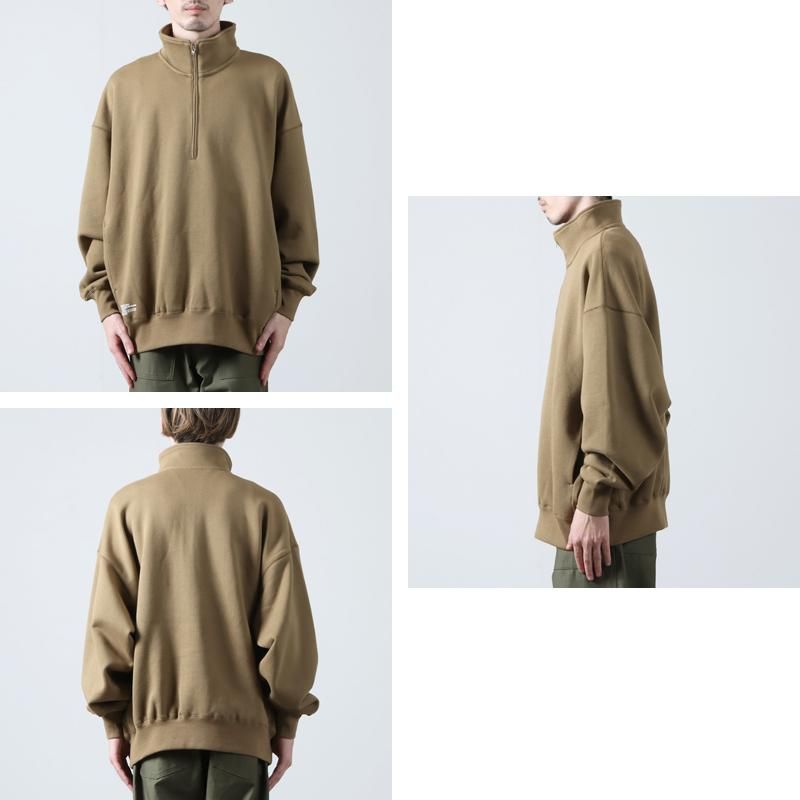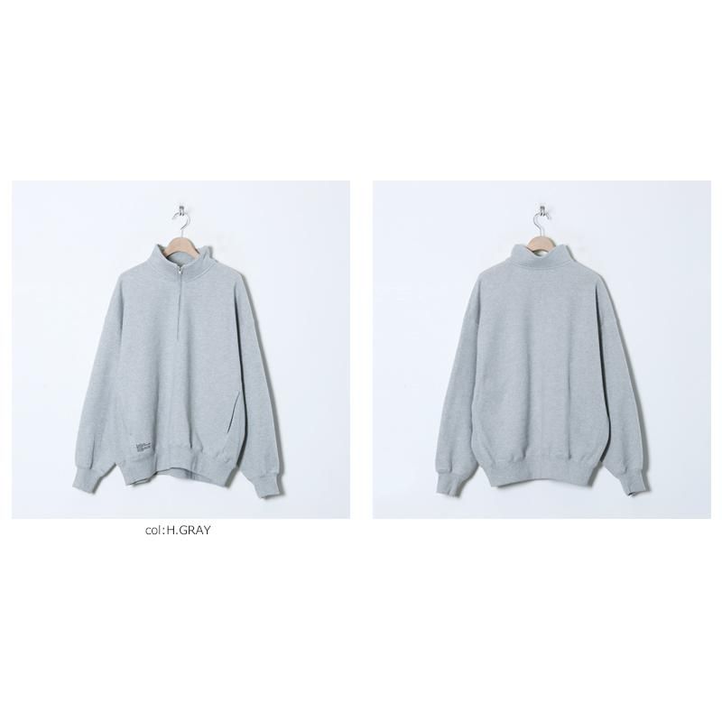 肩を落とし身幅にゆとりを持たせたシルエット。程良い開きのハーフジップ仕様でサイドをフライスで切り替えたデザイン。