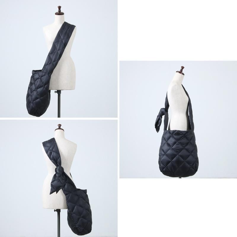 上品なキルティング加工と丸みのあるフォルムが、柔らかな印象と洗練された雰囲気を演出します。最大の特徴は、本体の脇から続いたベルトを好みの長さで結べる、リボンのようなディテール。この結び目が、コーディネートにさりげないアクセントを加えてくれます。