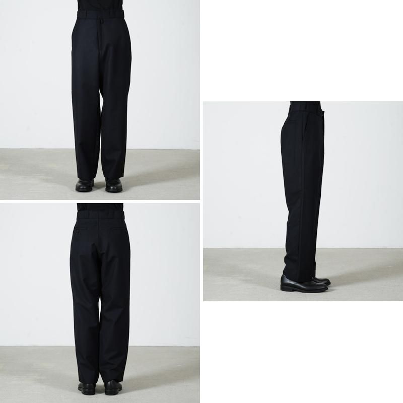 デザインの基になっているのは、オーセンティックなワークパンツ。太幅のベルトループやヒップの縫製仕様といったディテールを踏襲しつつ、ウエストにはスラックスに見られるベルトバックルのピンホルダーを配置することで、COMOLIならではの視点を加えています。