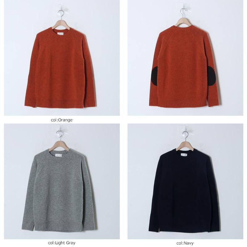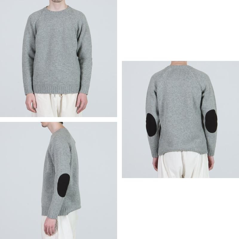 シンプルなデザインが特徴で、カラーリングも使いやすく、老若男女が着やすいデザイン。ニットアイテムの肘に施されたエルボーパッチも特徴の一つです。
